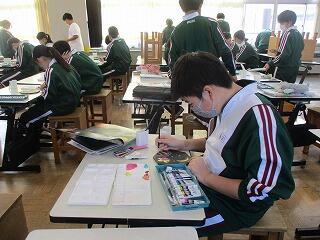 1年2組の美術の授業では、彫刻刀で木彫レリーフを作ったり、デザイン画を描いたりしていました。