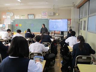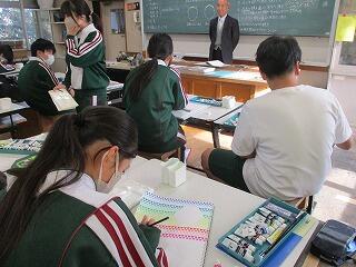 1年1組の数学の授業では、立体の展開図について学習しており、四角錐の展開図を書いていました。