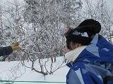 インストラクターさんから空気中の水分が木の枝にくっついて凍る現象の霧氷の説明をしてもらっていました。