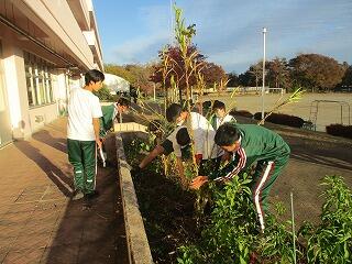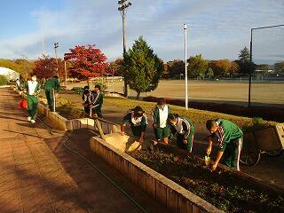 支援学級の1組の生徒は、校舎前の花壇に、大根の種をまきました。大きく実るのが待ち遠しいですね。