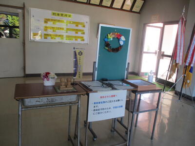正門のバラにつぼみがつきました。職員玄関の掲示物が変わりました。