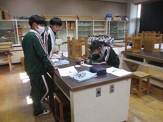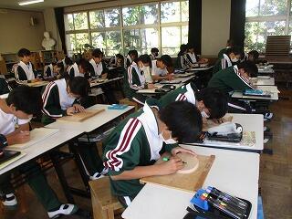 2年2組の美術の授業では、「飾りレリーフ」を作製していて、木彫のレリーフの板に彫刻刀を使ってデザインを彫り始めていました。