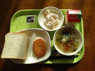 今日の給食は、食パン コロッケ(ソース)ミートボールスープ フルーツクリーム 牛乳でした。