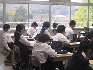 2年1組の国語の授業では、各自が定期テストに向けて、ワークや単元プリントの復習、端末を使って問題を解いている生徒もいました。