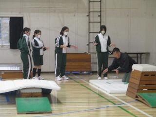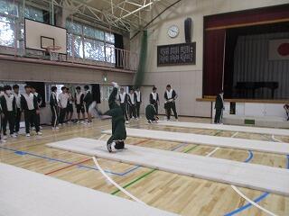 1年1・2組の体育の授業は、「器械運動」の単元が始まり、男女ともに「マット運動」を行っていました。