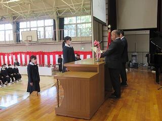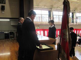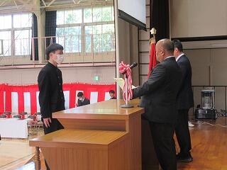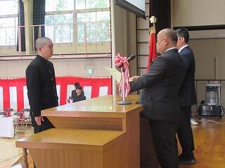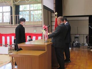 明日は、いよいよ卒業式です。本日は3年生の表彰式が行われました。市長賞や中学校体育連盟、並びに中学校文化連盟の賞状伝達をしました。また、学校生活において模範となる生徒に「学校長賞」を授与しました。表彰された皆さん、おめでとうございます。3年生の皆さんのこれからの活躍を祈念いたします。