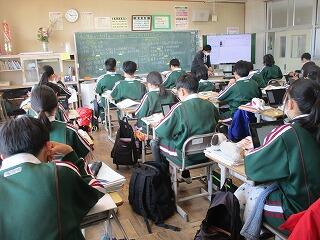 2年1組の数学では、端末を使って一年間の授業を振り返ってアンケートに入力していました。