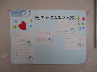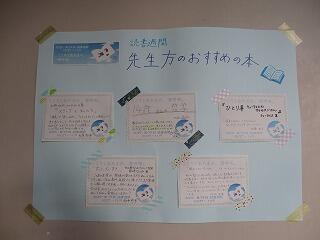 本日10月27日(月)から11月9日(日)の間、校内読書週間になります。よく「読書の秋」とも言われます。この機会に、少しの時間でも本を手にとって読んでみてはどうでしょうか?何を読もうか迷っている人は、図書室入り口や入ったところに本の紹介があります。気になった本は読んでみてください。また、各階の廊下には、「先生方お薦めの本」の紹介があります。参考にしてください。