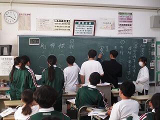 1年2組の国語の授業では、「漢字の部首について」学習していて、代表生徒が前に出て問題の答えを黒板に書いていました。