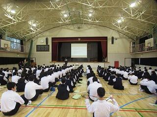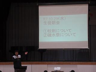 10月29日(水)全校朝会が行われ、生徒指導面の連絡と金曜日の磯水祭(きすいさい)について説明がありました。