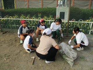 生徒たちは、出身小学校の先生方や後輩に会うことをとても楽しみにしていました。一緒に清掃や除草作業を一生懸命行っていました。