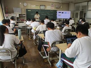 2年1組の技術の授業では、「自分の好きなもの」などについてプレゼンテーションができるように、端末を使って作成していました。