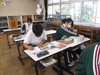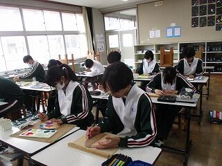 2年2組の美術の授業では、木製の飾りレリーフの作品が出来上がってきました。
