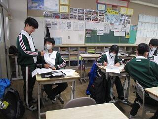 3年2組の英語の授業では、「相手と交渉する表現」について学習していました。