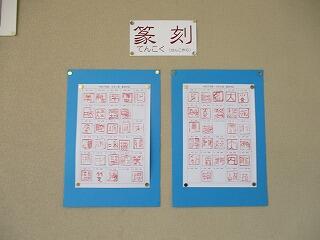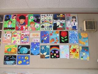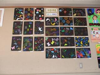 美術室の前や教室内に各学年の作品が飾られています。