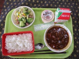 今日の給食は、 ごはん ハッシュドビーフ ブロッコリーサラダ チョコプリン 牛乳でした。